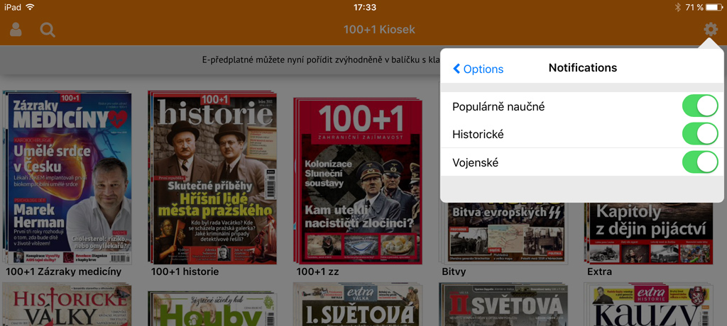 Nebo jiná situace: vydavatel, který v rámci Triobo Kiosku publikuje v jedné aplikaci více samostatných magazínů, definuje pro tematicky příbuzné skupiny magazínů společné notifikační kanály. Tak jak je to vidět na obrázku níže.